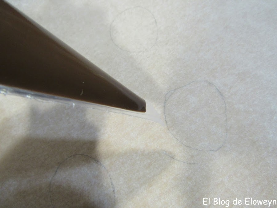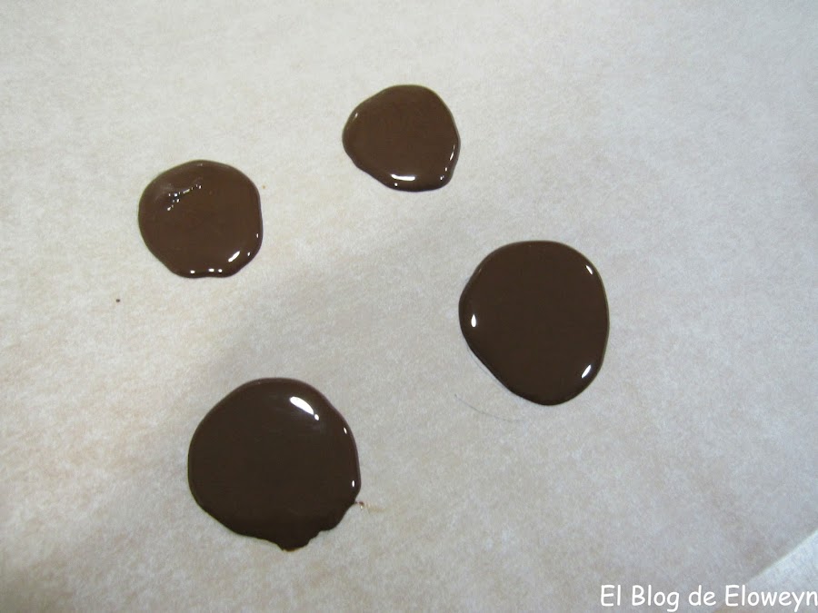 Para guiarme dibujé unos círculos encima del papel de hornear y le di la vuelta al papel, para que el chocolate no tocase el dibujo. De hecho, estos dibujos que hay en la foto eran demasiado pequeños y tuve que ampliarlos... jajaja.