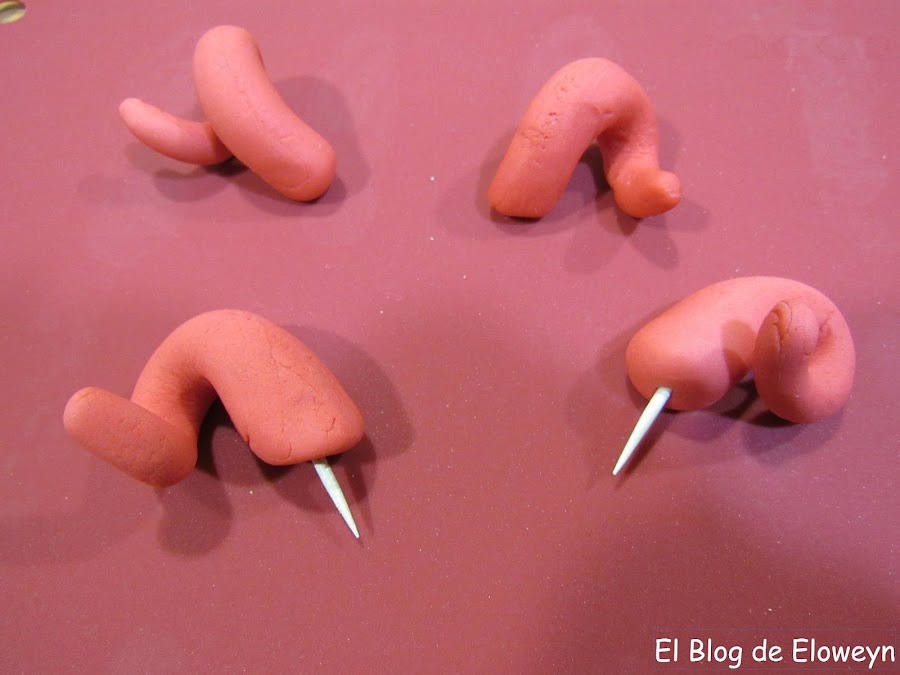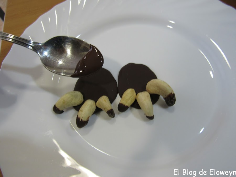 Sin esperar a que se solidifique el chocolate del pie, les ponemos las garras. Pondremos tres garras por pie.