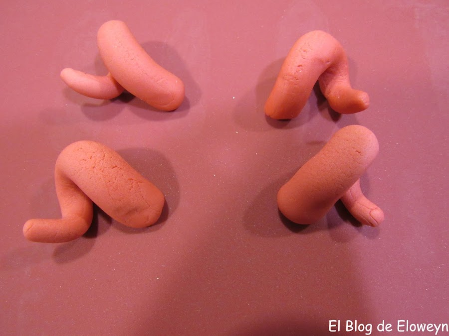 A continuación ponemos los pies. Yo lo hice sobre un plato, pero creo que os irá mejor hacerlo sobre la misma hoja de papel de hornear que habíais usado antes. Así, no hay peligro de que se os pegue.