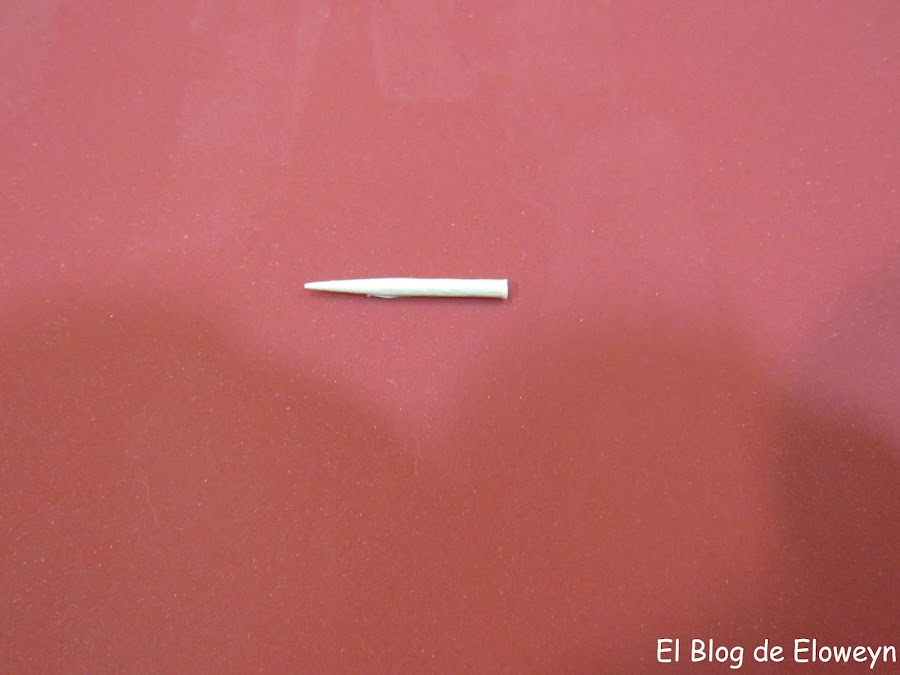 Clavamos el palillo en la base del cuerno, con cuidado de que no nos salga por ningún lado y dejando la parte de la punta más fina hacia fuera. Repetimos para todos los cuernos.