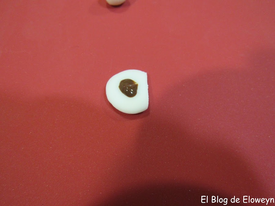 Esperamos que se sequen y pintamos las niñas de los ojos al bicho. La idea era dibujar las niñas de los ojos alargadas, como las de un gato, y usé una especie de lápiz pastelero de chocolate, pero creo que hubiese quedado muchísimo mejor si lo hubiese hecho con el chocolate derretido que tenía y un pincel :(.