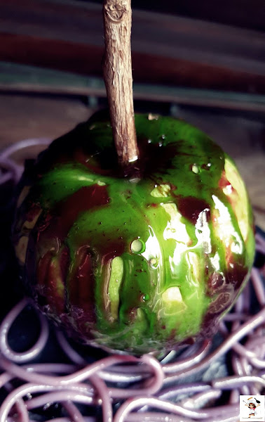 4. Cuando la poción este lista, cogemos nuestra manzana y mientras vamos recitando el conjuro de envenenamiento, vamos introduciéndolas dentro del caramelo hasta que quede bien caramelizada. Dejamos escurrir un poco y la depositamos sobre un papel sulfurizado para que seque.