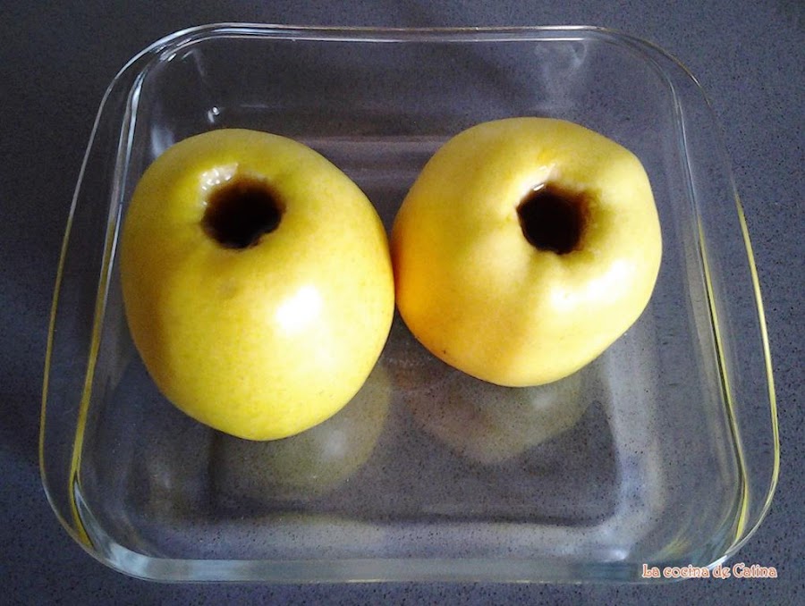 Quitar el corazón de las manzanas sin calar hasta el fondo. Colocarlas en una bandeja de horno y rellenar cada agujero con 1/2 cucharada de azúcar y el vino dulce.
