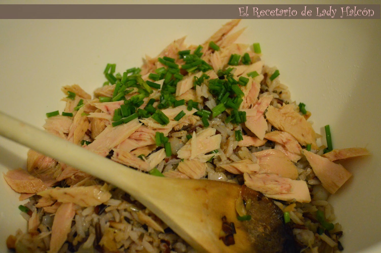 Una vez que se haya templado el arroz, añade el bonito desmenuzado y el cebollino picado y remueve para que se mezclen bien. Reserva hasta que vaciemos las manzanas.