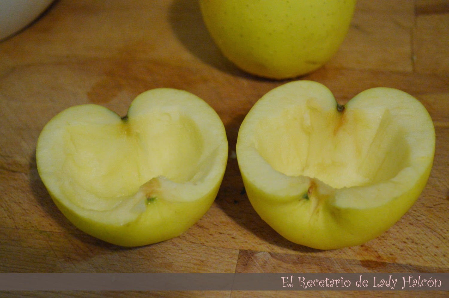 Lava bien las manzanas y córtalas por la mitad. Con la ayuda de un cuchillo quita el corazón con las pepitas y vacía el resto de la manzana con una cuchara para crear una especie de cuenco. Procura no dejar los bordes muy finos ya que se romperá. La manzana que retires puedes añadirla troceada al arroz.