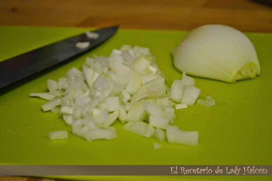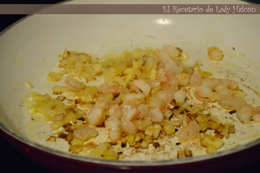 Añade la cucharada de margarina a la sartén, espera a que se deshaga y añade la cebolleta. Rehógala hasta que empiece a tener color (un poco menos que las nuestras, que haciendo las fotos se me pasó un poco jeje), añade las gambas troceadas y remueve.