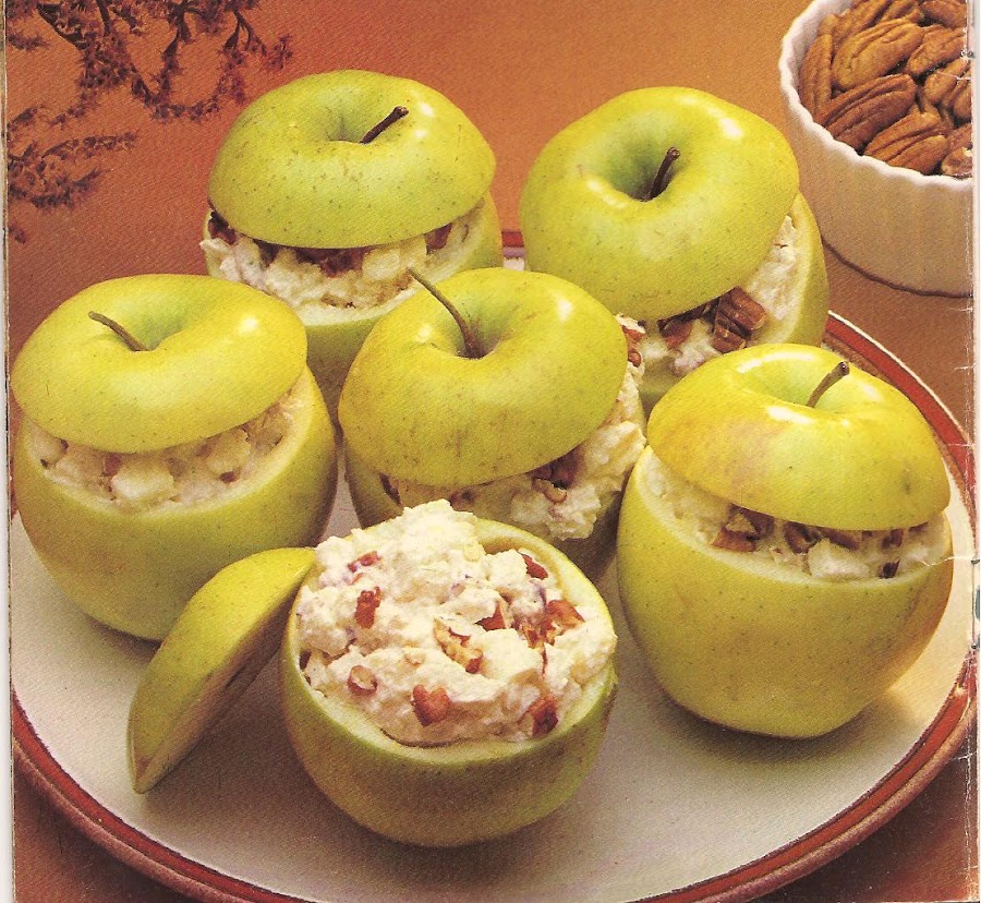 Cortales a las manzanas una tapita en la parte superior. Con cuidado sacales la pulpa y pícala. Mezcla con el queso crema, la nuez y los panquecitos. Rellena con esto las manzanas, ponles la tapa y refrigera hasta el momento de servir.