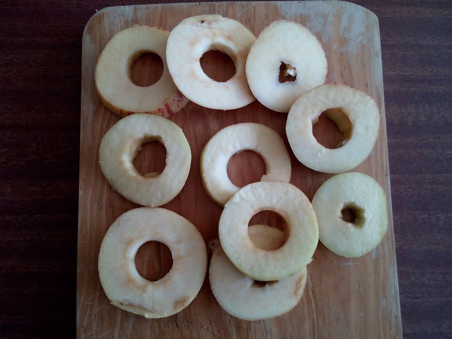 Cortamos las manzanas en rodajas y las descorazonamos.