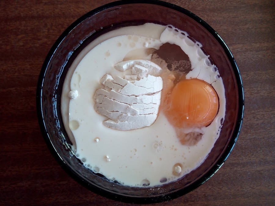Mezclamos harina, leche, aceite y huevo hasta conseguir una consistencia homogénea.