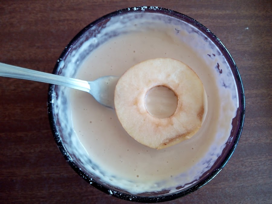 Bañamos cada rodaja de manzana en esta preparación y las freímos en abundante aceite.