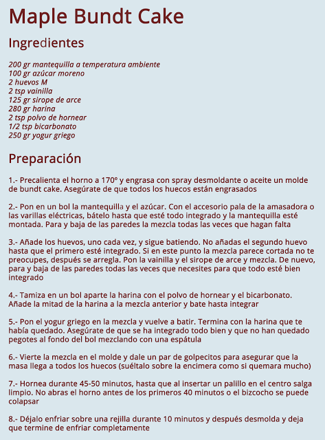 Para tal ocasión, decidí preparar este bundt cake de sirope de arce, aprovechando además que había invitados a comer, porque este bundt vale lo mismo para tomar con el café después de comer que para desayunar. No puedo describir el sabor, solo puedo decirte que lo pruebes, es super jugoso y delicioso