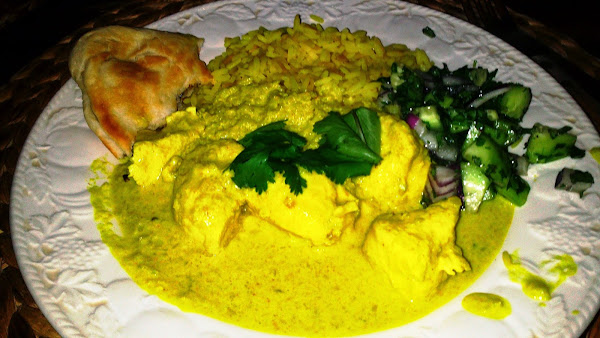pan naan, arroz blanco y ensalada de pepino para acompañar.