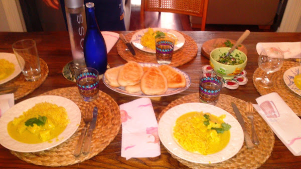 Acompañamos de arroz blanco, pan naan y ensalada de pepino.