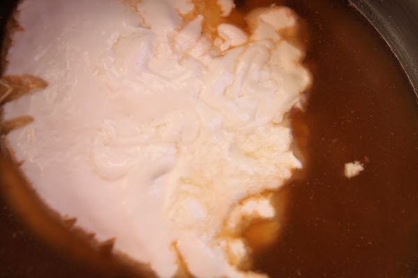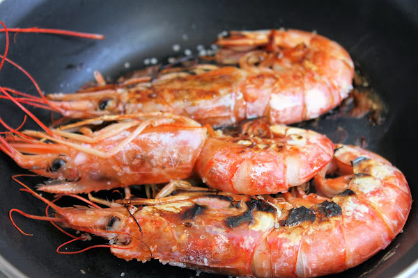 Ponemos a hervir el caldo que teníamos reservado con la nata (crema de leche), añadimos el queso y la pimienta molida (opcional). Apagamos el fuego y echamos las gambas arroceras previamente peladas, con el calor residual de cuecen.
