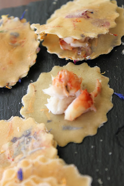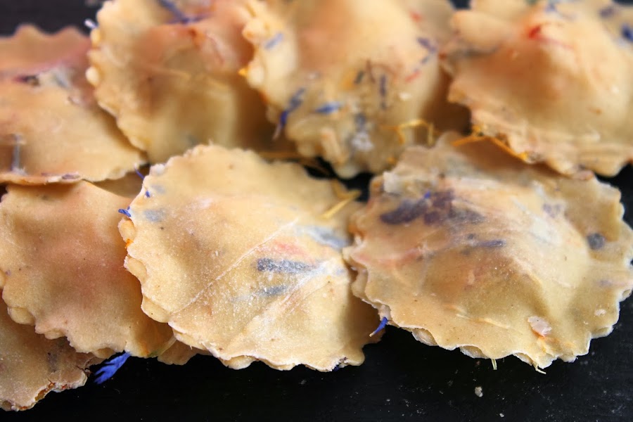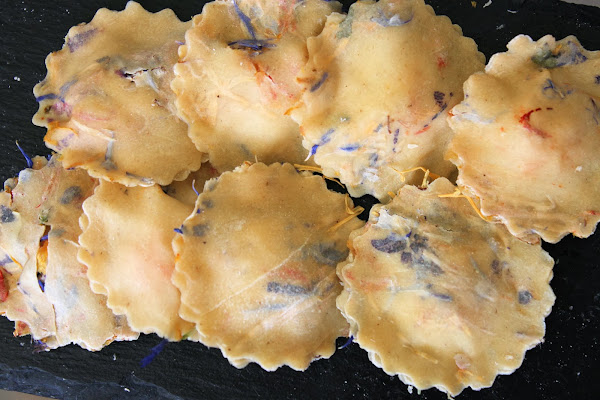 Rellenar entre dos láminas de la pasta floreada con el desmenuzado que teníamos reservado y humedeciendo los filos de las mismas para que se cierren bién.