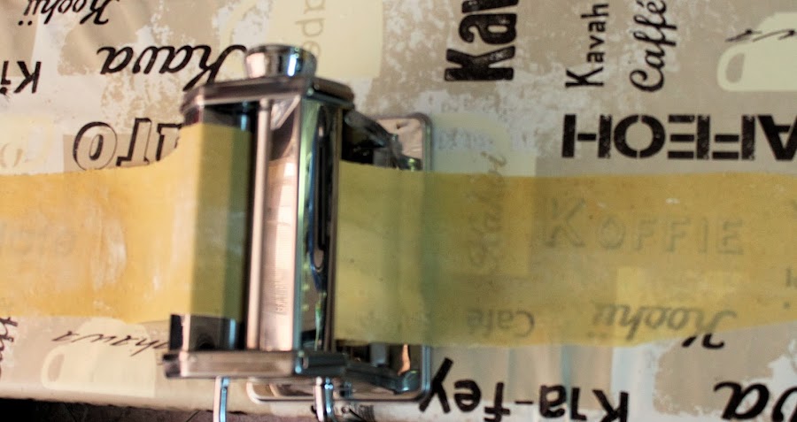Pasamos la masa por la máquina de pasta o con un rulo la estiramos muy fina; se hace una tira de unos 8-10 cm. apróx. Debe ser lo más fino posible, que se transparente.