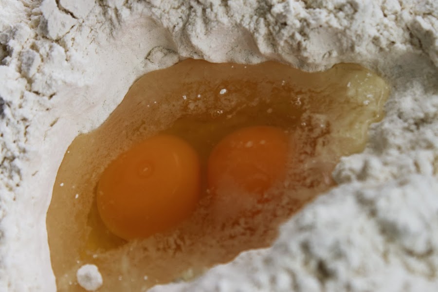 remover los huevos con tenedor y a la vez se va recogiendo la harina poco a poco; cuando no pueda seguir con el tenedor se sigue con las manos añadiendo unas gotas de aceite (4-5 no más); amasar hasta que esté la masa fina y elástica. Hacer una bola con ella, dejar en un cuenco con un poco de harina para que no se pegue y cubrir con un paño húmedo para que no se seque.