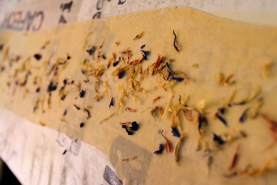 Tapar la alfombra con la otra mitad de la tira de pasta y presionar para que se queden las flores adheridas. Pasar de nuevo esta doble tira con los pétalos por la máquina o el rodillo.