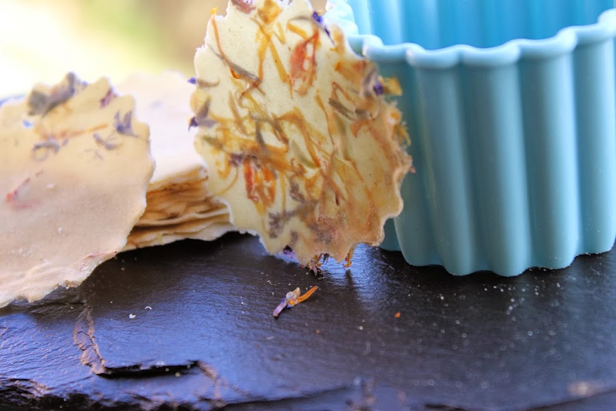 Cortar por la mitad y cubrir una de ellas con una alfombra de pétalos de flores.