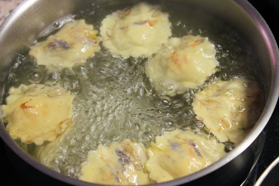 Poner a hervir agua con una pizca de sal, cocer la pasta un par de minutos (no mucho más que al ser pasta fresca se hace enseguida), retirar a un colador y reservar.