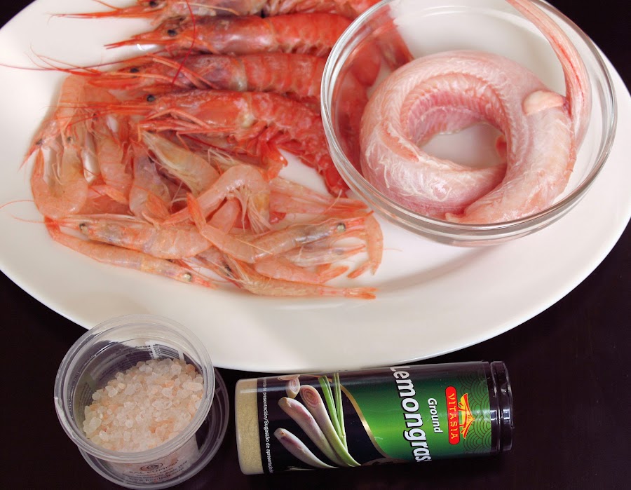 Mientras, asamos los gambones con los pétalos de sal y cocemos la pintarroja en abundante agua con sal común y el laurel durante 5´.