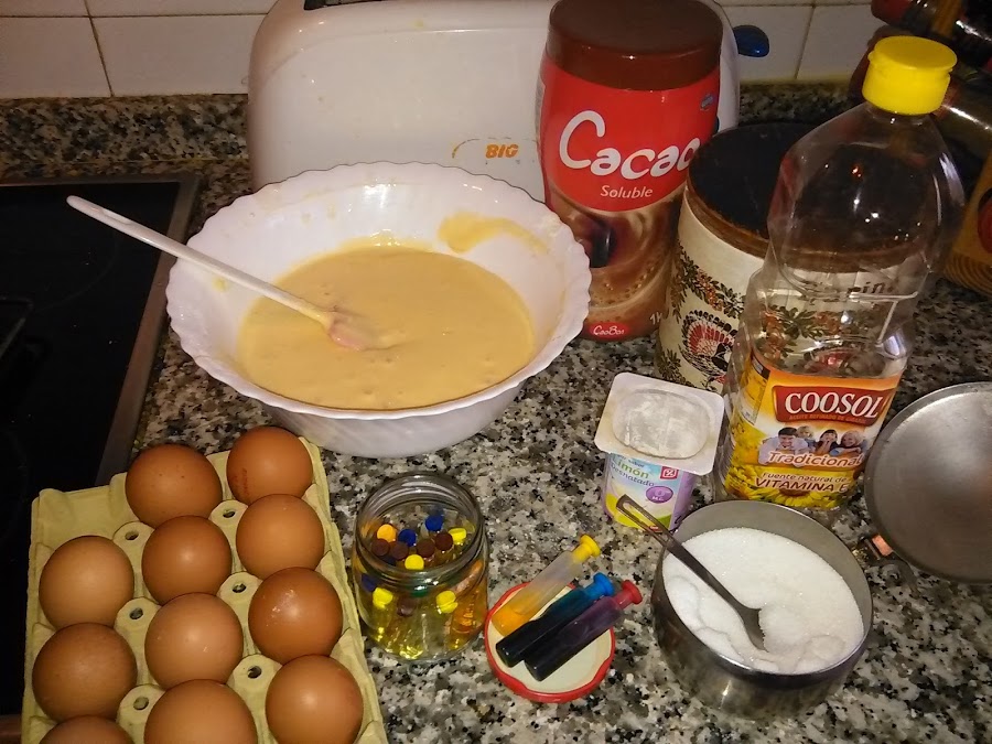 Ponemos los huevos en la batidora, batimos a velocidad media, procurando que nos quede el batido esponjoso y aireado. Añadimos ahora poco a poco el azúcar mientras seguimos batiendo y mezclando de la misma manera. Toca el turno del aceite, lo vertemos despacio y lo vamos mezclando con el resto de ingredientes. Seguimos el mismo proceso con el yogurt y por ultimo la harina, que habremos mezclado con la levadura , estas se tamizaran juntas y se van agregando poco a poco