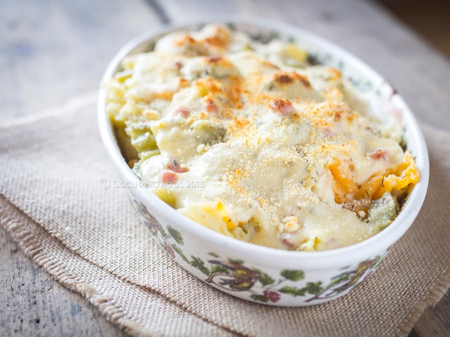 Seguramente ya estará la pasta, así que lo escurrís (guardad un poquito del líquido para unir a la salsa bechamel) y lo echamos a un cuenco. Echamos la mezcla de bechamel encima y removemos bien.
