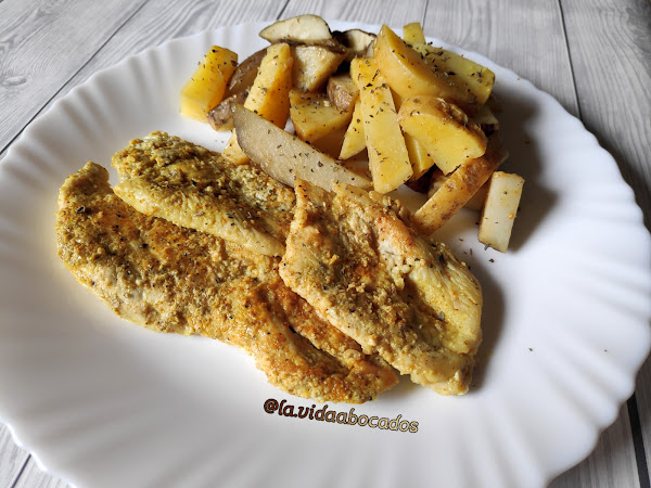 Si optas por acompañar con unas patatitas como he hecho yo, un truco es que, una vez que las tengas cocinadas, les des un par de vueltas en la sartén con el jugo donde han macerado los filetes toda la noche para que absorban el sabor de la especias y el limón.