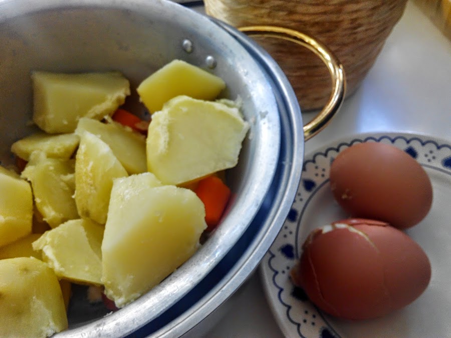 1.- Pelamos las patatas, las lavamos bien, las troceamos y las ponemos a cocer en una olla con agua y sal, durante aproximadamente 15 minutos. Dejamos enfriar y reservamos.