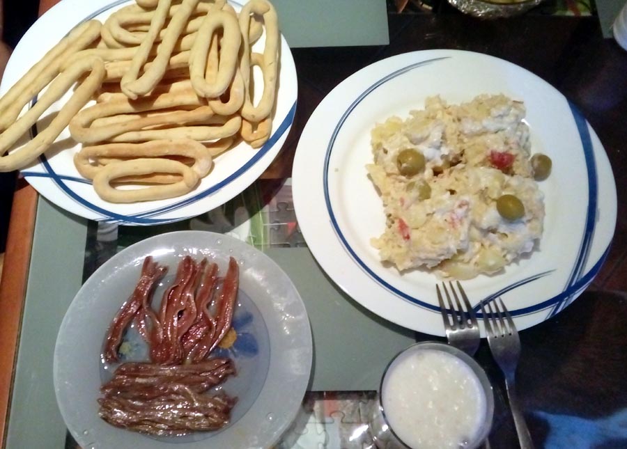 Como veis la rosquillas, quedan así y se acompañan de una buena ensaladilla rusa y sobre ella una anchoa de lata.