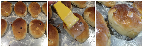Preparamos un glaseado con 1 clara de huevo y el azúcar glas. Retiramos los panes del horno y pintamos con el glaseado mientras están calientes.