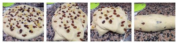 Volcamos la masa en la encimera y aplastamos con los dedos para quitar el exceso de gas que se genera con el leudado. Esparcimos las pasas de uva y el mango sobre la masa, cortamos la masa en dos y superponemos las partes, aplastando bien con las manos. Cortamos otra vez en dos y repetimos la operación. Amasamos y formamos un rulo que cortaremos en 8 porciones.