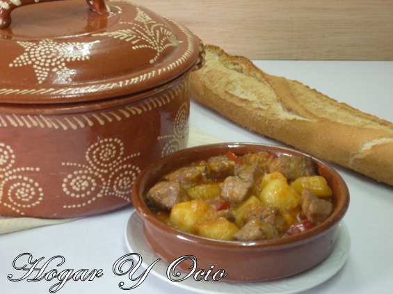 5. Pelamos las patatas y las cortamos en tacos (comenzamos haciendo un corte limpio y luego las tronchamos). Las incorporamos a la cazuela y las cubrimos con el caldo. Salpimentamos y dejamos cocinar hasta que comiencen a estar tiernas.