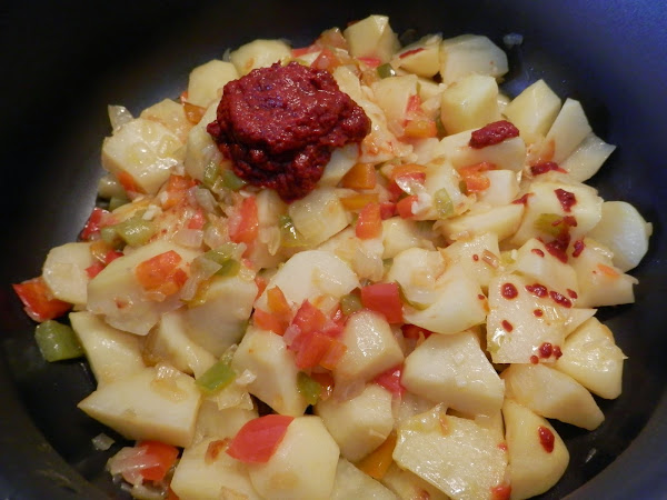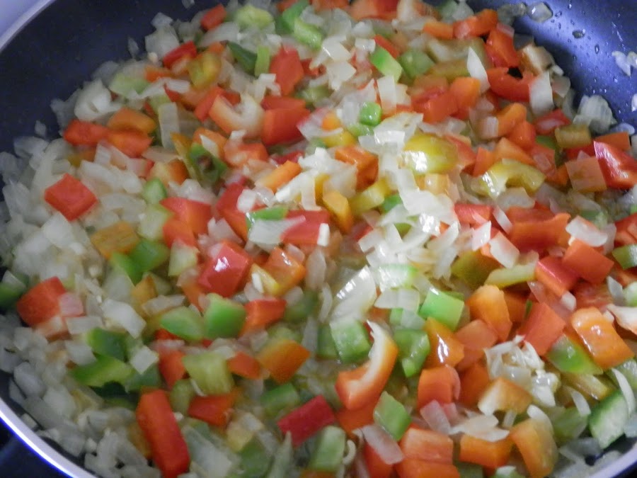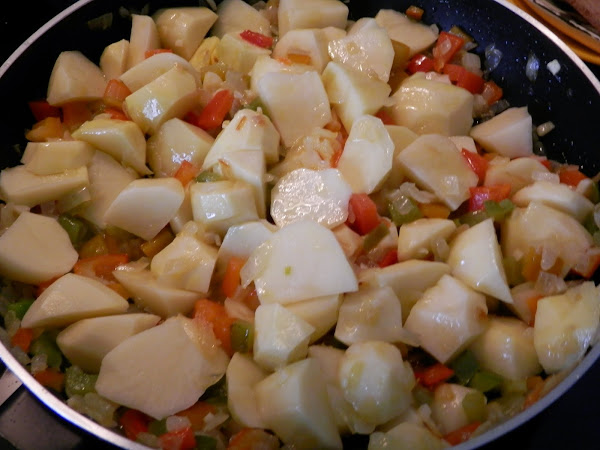 Sofreímos todo junto y añadimos la carne de pimiento choricero.