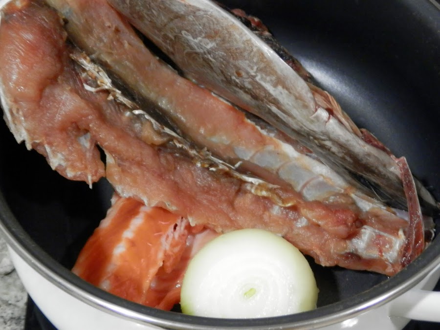 En una cazuela, ponemos las espinas y una de las cebollas. Añadimos agua y ponemos a cocer durante una hora.De aquí, el caldo.