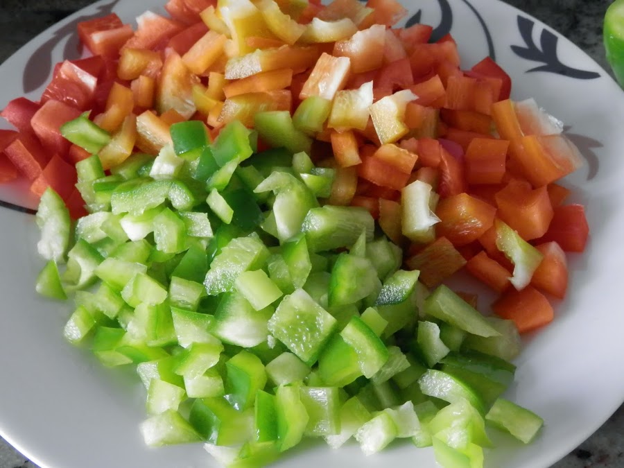 Picamos por separado los pimientos, la otra cebolla y los ajos.