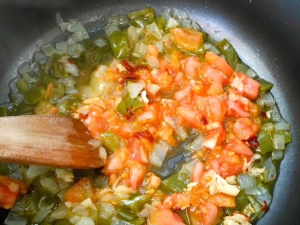 Cuando las hortalizas estén tiernas agrega a la cacerola el tomate escaldado y picadito más el contenido del mortero. Deja cocer el contenido de la cacerola durante 6 minutos a fuego medio. Este paso también debes realizarlo con la cacerola tapada.