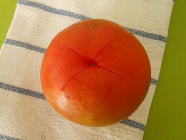 Tras esto, haz un corte en forma de cruz en la base del tomate y sumérgelo en un cazo con agua hirviendo.
