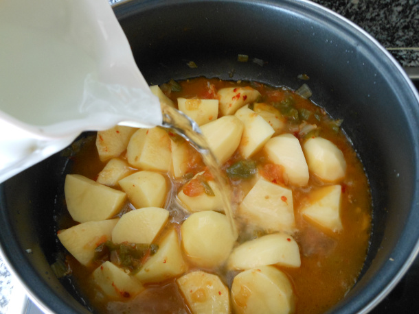 Transcurrido los 12 minutos de cocción de las hortalizas, introduce las patatas troceadas en la cacerola, cúbrelas de agua, agrégales sal fina al gusto y si lo deseas puedes potenciar el sabor del guiso con una pastilla de caldo de pescado.
