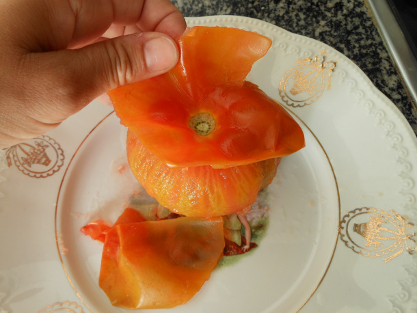 Deja que el tomate se enfríe un poco, después retírale la piel y pícalo. Reserva.
