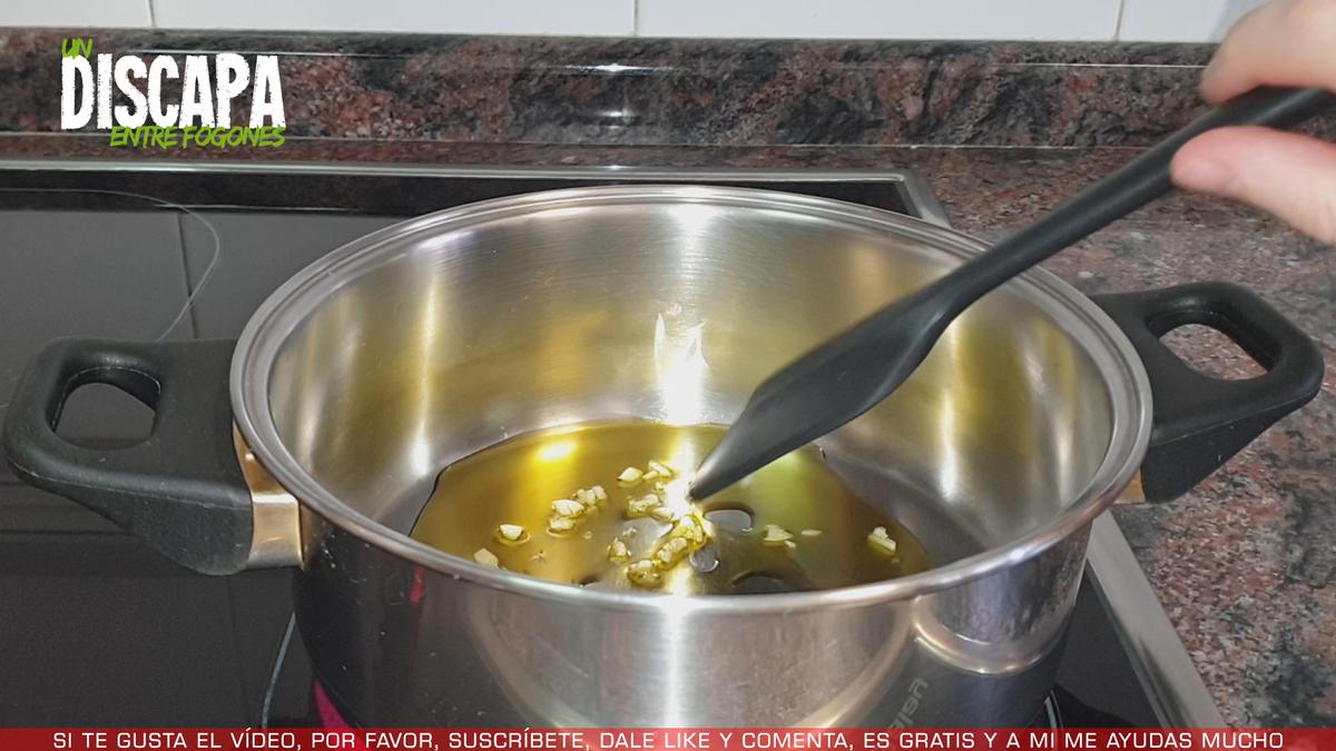 2Mientras tanto, vamos a trocear un diente de ajo en trocitos pequeños y cuando el aceite ha cogido temperatura, añadimos el ajo picado. Dejaremos que se vaya dorando a fuego medio.