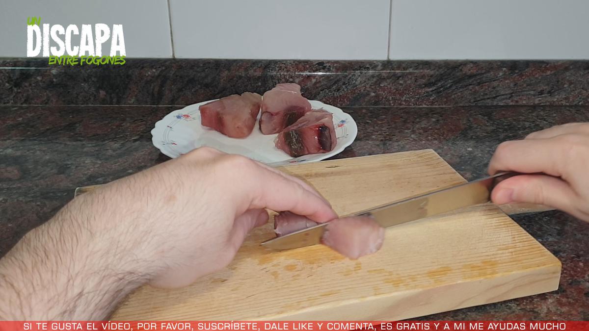 11Mientras se van cocinando las patatas vamos a trocear el bonito. Yo tengo una rodaja de bonito a la que le voy a quitar las partes más oscuras. Y después lo partimos en trozos ni muy grandes ni muy pequeños, más o menos en trozos de bocado. Añadimos sal al gusto al bonito.