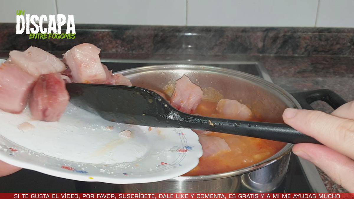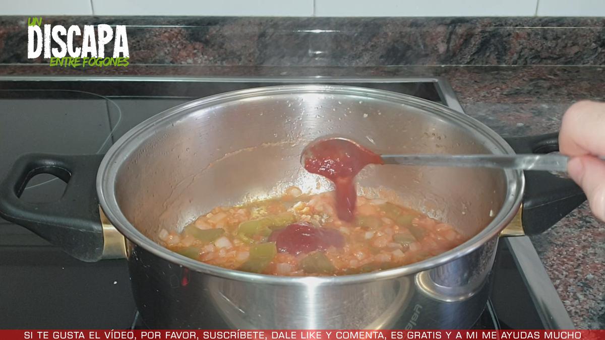 7Y también añadimos una cucharadita de pulpa de pimiento choricero. Y dejamos que se siga pochando.