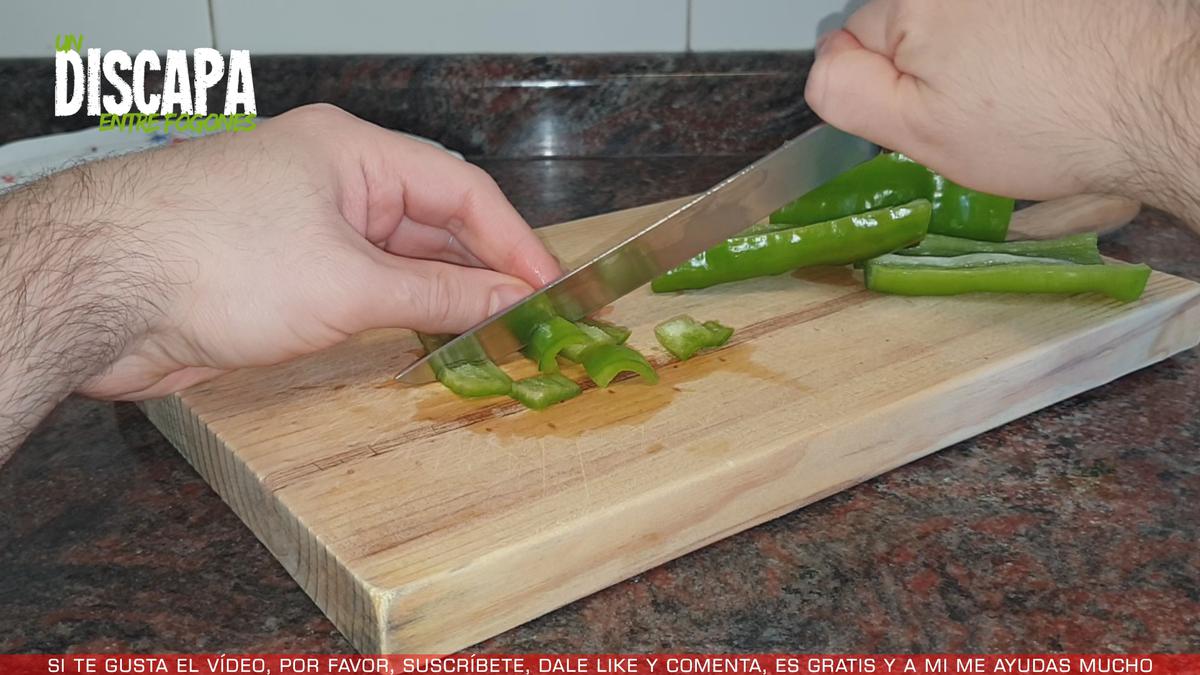 3Mientras se va dorando el ajo, vamos a trocear un pimiento verde en cuadraditos ni muy grandes ni muy pequeños. Queremos que se vean los trozos en el marmitako.