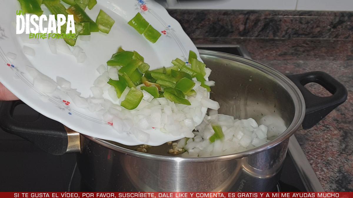 5Cuando los ajos han empezado a coger color, añadimos a la cazuela el pimiento verde y la cebolleta. Le ponemos una pizca de sal. Removemos y dejamos que se poche a fuego medio.