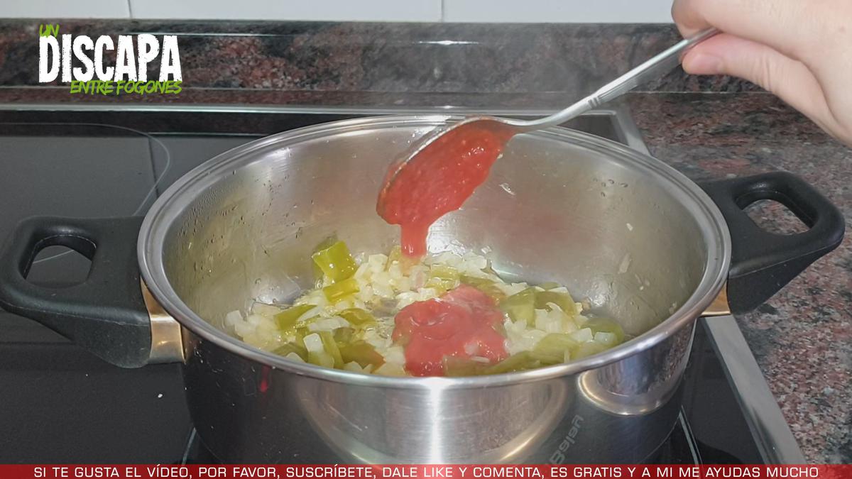 6Cuando ya esta media pochado, añadimos dos cucharadas de tomate triturado. Mezclamos bien.