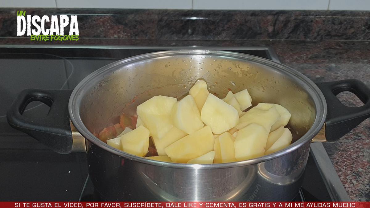9Cuando ya tenemos todas las patatas troceadas, las añadimos a la cazuela. Mezclamos bien.