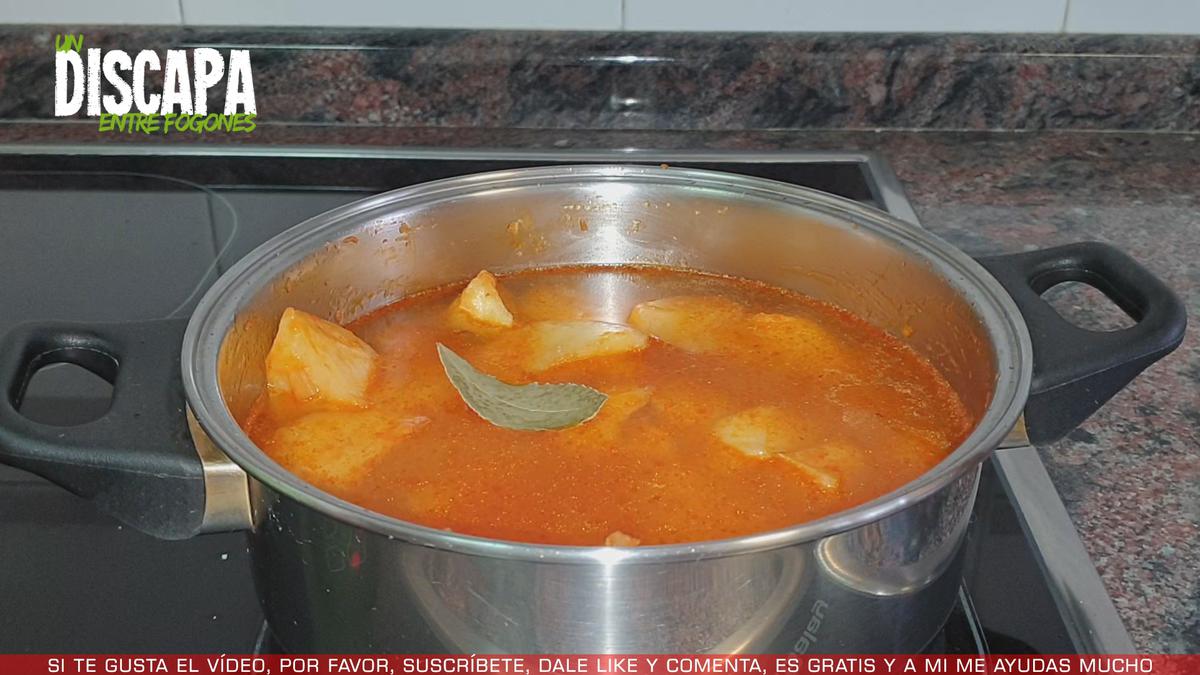 10Ahora le voy a añadir un caldo de pescado, si no tenéis caldo de pescado, le podéis añadir agua sin problema. Lo único que con el caldo nos quedará un marmitako más sabroso. Cubrimos las patatas con el caldo, le ponemos una hojita de laurel y le ponemos sal al gusto. Removemos bien, le ponemos la tapa a la cazuela y dejamos que se cocine a fuego medio durante unos 20 o 25 minutos. Dependerá del tamaño que hayais cortado las patatas.