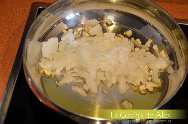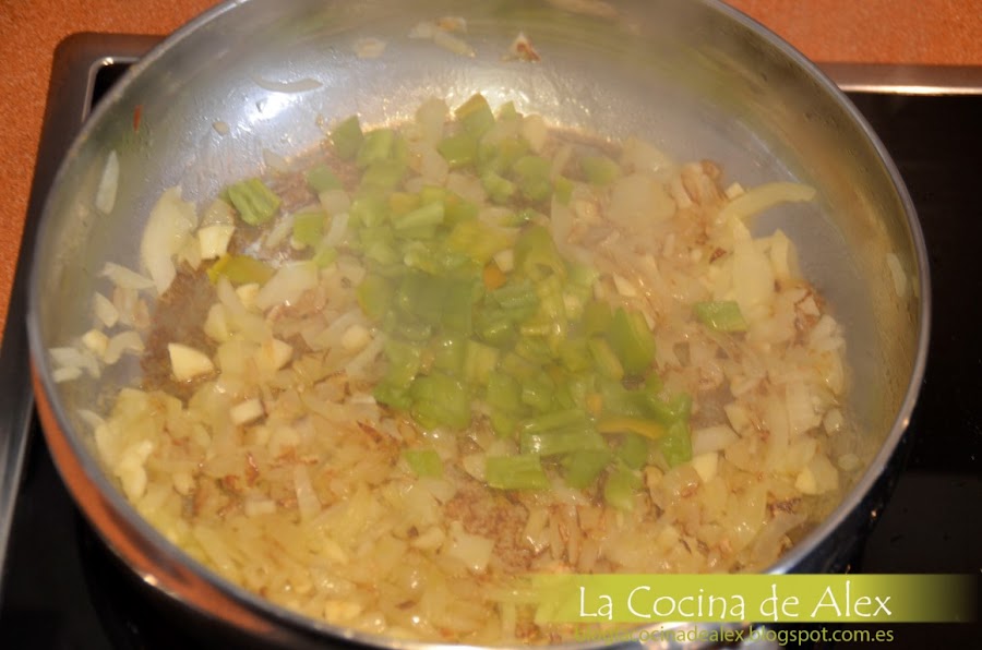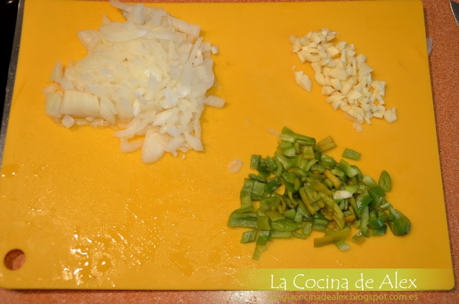 Cortamos la verduras y en una sartén ancha con tapa o una cazuela baja ponemos aceite de oliva y doramos el ajo junto con la cebolla, una vez esta dorado agregamos el pimiento verde y seguimos dorando todo junto.