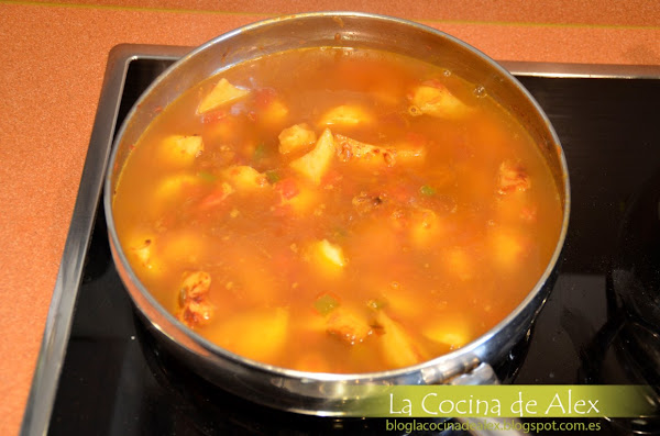 Antes de que el pimentón se queme le incorporamos el caldo que estábamos haciendo, previamente colado, hasta cubrir la patata y un poco mas. Rectificamos de sal y pimienta y tapamos la cazuela. Dejamos cocinar a fuego medio bajo durante 15-20 minutos o hasta que la patata este tierna y se deshaga cuando cuando la aplastemos con un tenedor.